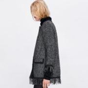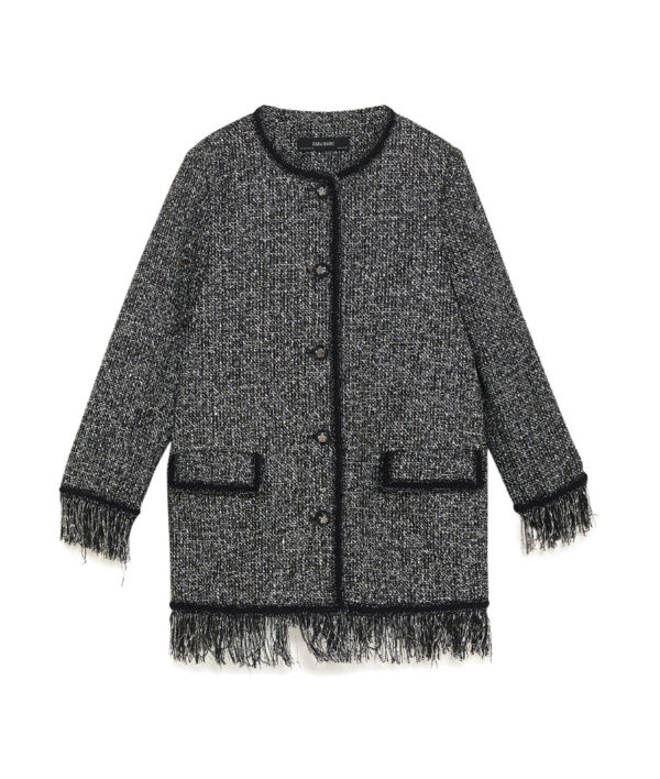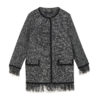 Round neck long-sleeved jacket. Front flap pockets. Frayed trim with contrasting piping. Front metal button closure.